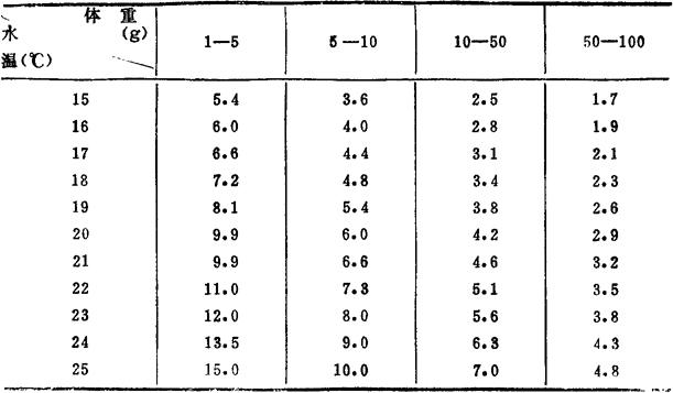 | 释义 | 投饵网箱培养鲤鱼种 一、夏花进箱 鲤鱼夏花鱼种入箱规格应在全长4—5cm,平均尾重2—3g为宜,尾重小于1g的不适于饲养,而且出箱规格偏小。 鱼种入箱前应进行密集锻炼,以免入箱后死鱼。鱼种要及早入箱,保证较长生长期,以育成符合要求的大规格鱼种。入箱密度一般为800—1000尾/m2。为防止鱼体擦伤,网箱要提前3—5天入水,使附生生物得以生长。为防止鱼病发生,应在箱内用漂白粉或硫酸铜挂袋,每箱4—6袋,每袋装药50—100g。 二、饲料及投喂 投喂全价颗粒饲料,饲料的配方及制备参阅第五章。鱼种入箱后,要每天投喂5—6次,并配合以固定音响,使鱼种养成集中吃食的习惯,驯导过程可在3—5天内完成。 投喂次数的确定与水温、水质及鱼的生长情况有关。20℃以下每天3—4次,21—25℃每天4—6次,25℃以上每天6—8次。目前投饵多用手撒法。每箱每次投喂时间不少于10—15min,要认真细致操作。在每次投饵过程中,根据鱼群抢食强度的前后变化,要先慢、少、再快、多,最后又慢、少。 根据投饵率和所喂鱼的体重计算日投饵量。水温、体重与投饵率的关系见表28—2。具体投饵量还要视鱼种吃食情况灵活控制,以大多数鱼种吃饱游走为宜。 表28—2 网箱培育鲤鱼种投饵率*