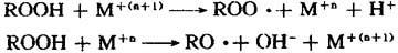 从以上式子可以看出,氧化初期形成的氢过氧化物对氧化反应有自动催化作用,故一般将此氧化过程又称为自动氧化。绝大部分塑料和橡胶的氧化都是按这一机理进行的。光能和热能既是产生初始自由基的能源,又能够加速氢过氧化物的分解,从而大大加速氧化的进行,因此,根据氧化过程中破坏能量的主要来源,通常又将聚合物的氧化分为热氧化和光氧化等。关于光氧化和光稳定剂已在第三章介绍,本章主要介绍热氧稳定剂,即通常所称的抗氧剂。 一些变价金属离子如锰、铁、钴、镍、铜等,通过电子的转移也可催化氢过氧化物的分解: