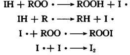 无论是断链还是交联都会给材料的力学性能造成不可逆的恶变,而各种羰基化合物的形成和积累又会引起材料的变色,损害其外观性能。 2.抗氧剂的作用机理 应当指出,抗氧剂的作用机理非常复杂,许多问题尚未明了,对现象的解释亦常有争议,以下所介绍的是目前比较普遍的一些认识。 (1)链终止剂 该类抗氧剂能够与自动氧化反应中的链增长自由基(R·和ROO·)反应,使链式反应中断,故又称自由基抑制剂。根据其抑制自由基的方式可分为如下三种。 ① 氢给予体 这类抗氧剂包括受阻酚和仲芳胺,是目前应用最广泛的一类抗氧剂。它们含有反应性的=NH或—OH基团,能与聚合物争夺自动氧化中形成的过氧自由基,通过氢原子的转移,形成ROOH和一个稳定的抗氧剂自由基(>N·或—O·),该自由基又具有捕捉活性自由基的能力,可以终止链式氧化反应的第二个动力学链。以HI表示氢给予体,抑制过程可表示如下: