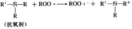 前已述及,氢给予体释放出氢原子中断活性链后,生成的稳定性自由基也具有捕获自由基的能力。在光稳定剂一章中已介绍的受阻胺类化合物,其抑制光氧化的机理也是捕捉自由基(见第三章)。 ③ 电子给予体 一些叔胺抗氧剂能够向活性自由基提供电子,使其成为低活性的负离子,从而中断链式氧化反应: