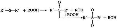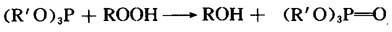 这一机理的提出主要用于解释不含活泼氢的叔胺的抗氧机理,但还缺乏充分证据,有待深入研究。也有人提出这类化合物的抗氧机理是氮原子相邻碳原子上的氢与自由基反应,按照施氢机理发挥效用。 (2)过氧化物分解剂 这类抗氧剂主要包括亚磷酸酯类和有机硫化物类,它们能够将氢过氧化物分解成不活泼产物,抑制其自动催化作用。例如: 亚磷酸酯类:
