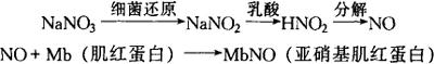 | 释义 | 护色剂 护色剂又称发色剂,是能与肉及肉制品中呈色物质作用,使之在食品加工、保藏等过程中不致分解、破坏,呈现良好色泽的物质。这主要是由于亚硝酸盐所产生的一氧化氮与肉类中的肌红蛋白和血红蛋白结合,生成一种具有鲜艳红色的亚硝基肌红蛋白和亚硝基血红蛋白所致。硝酸盐则需在食品加工中被细菌还原生成亚硝酸盐后再起作用,其作用机理如下: