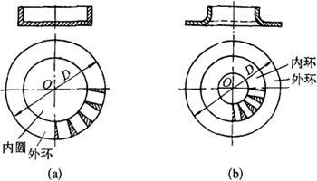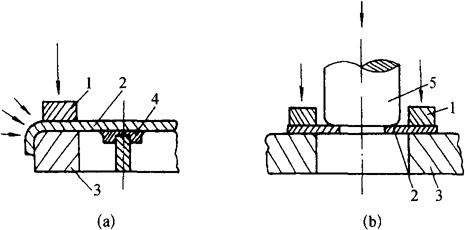 图6-51 胎型拔缘 (a)外拔缘;(b)内拔缘 1-压板;2-坯料;3-胎型;4-钢套;5-凸块 ②利用胎型内拔缘时[图6-51(b)],弯边比较困难。内孔直径不超过80mm的薄板拔缘时,可采用一个圆形木槌一次冲出弯边;较大的圆孔和椭圆孔的厚板内拔缘时,可制作一个圆形的钢凸模进行一次冲出弯边。 |
