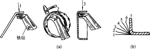 图6-50 外拔缘操作过程 (a)1-先弯;2-制皱褶;3-打平皱褶;(b)薄板拔缘顺序 ③拔缘时,锤击点的分布和锤击力的大小要稠密、均匀,不能操之过急,如锤击力量不均,可能使弯边形成细纹皱褶而最后发生裂纹。 2.胎型拔缘的操作过程 ①利用胎型外拔缘时,一般采用加温拔缘的方法。拔缘前,先在坯料的中心焊装一个钢套,以便在胎型上固定坯料拔缘的位置,如图6-51(a)所示。坯料加热温度为750~780℃左右,每次加热线不宜过长,加热面略大于坯料边缘的宽度线,按照前述外拔缘过程分段依次进行,一次弯边成形。