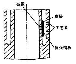 拖拉机水道内壁穿孔的修复主要采用胶接与补强钢板相结合的方式,工艺简便可行,经济效益明显,成本仅为新缸套的1/20,修复后使用期可超过4年.如图8-9所示.