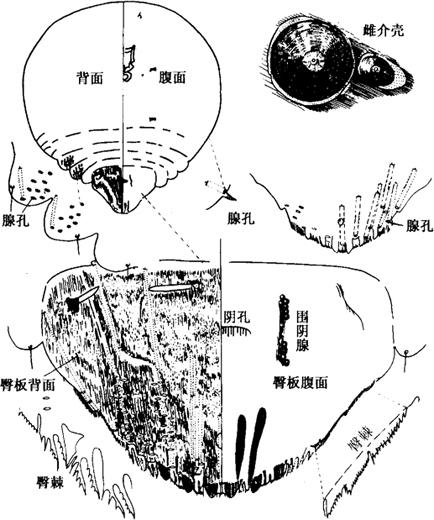 | 释义 | 拟褐叶圆蚧 【学名】 Chrysomphalus bifasciculatus Ferris。 【别名】 酱褐盾蚧。 【分布与为害】 分布于山东、河北、宁夏、江苏、浙江、辽宁、湖南、福建、湖北、四川、广东等地。寄主有苏铁、桂花、花叶万年青、广玉兰、山茶、月季、兰花、象牙红、夹竹桃。若虫与雌成虫吸汁液,为害枝叶。 【形态特征】 雌介壳暗酱色,圆形,壳点在中央,色较淡。雄介壳椭圆形,色与质地同雌介壳。壳点在一端近中央。雌成虫圆形。体长0.63~0.76毫米,宽0.59~0.66毫米。前体部膜质,阴腺4群。每群2~5个。臀叶3对,发达,纵轴均垂直,外侧有1凹缺。3叶同大,第四叶稍小。在第三叶以内的臀栉均为细长刷状,第三至四叶间,每臀节呈双叉形,分枝强烈,叶角及叶间硬化棒正常,但第三至四叶间趋向于不发达。第二、三腹节侧缘各有1群腺管,每群约10管。肛门离中叶硬化棒端部为本身直径的1倍以上。胸部侧疣粗锤状,硬化。本种特点为臀前腹节侧有2群腺管。