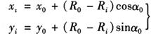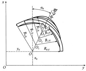 图13-23 双曲拱坝的平面投影图 拱坝在浇筑前,首先要整体清基,河谷两侧的清基开挖线是各层坝端与山坡交点的连线。在施工中,拱坝是按高程分层、分段和分块浇筑,放样任务就是分层、分段放出每块立模线的位置。拱坝的放样常用前方交会法;如果量距方便,有时也采用极坐标法。当测图控制点的精度和密度能满足放样要求时,可以直接依据这些控制点按测图坐标进行放样;反之,则按测图坐标重新布设。放样的方法和步骤介绍如下: 1)从设计图上量取拱坝中心线的方位角α0和离坝最远圆心的坐标x0,y0,依此作为推算其他曲线点坐标的起算数据。其中,α0一般应量取中心线上两点的坐标进行反算求得。 2)根据离坝最远圆心对应的半径与其他圆心对应的半径之差,以及中心线的方位角计算出其他圆心的坐标,即