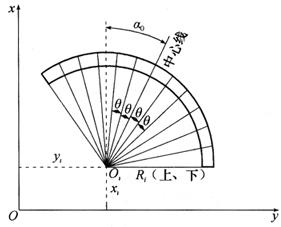 3)将每层拱圈从中心线向两边分成若干个相同的等份(图13-24),每等份的大小视具体要求而定(如分块大小、放样精度),两端可能不足一等份。根据各等分角边(半径)与中心线的夹角计算出各角边的方位角。