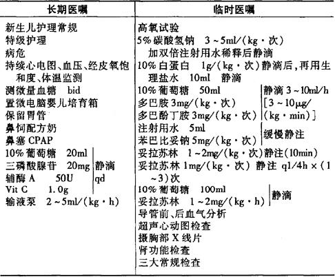 说明:1.尽快升高血压,一般当血压高于正常10~20mmHg后(收缩压大于80mmHg)才可用降肺动脉压药物。 2.保持患儿安静,不要搬动患儿。 3.碱化血液,使pH升至7.5左右。 4.妥拉苏林静注剂量:首剂1~2mg/kg(10分钟注完),此后每15分钟重复一次,每次量1mg/kg,一般不超过3次。皮肤转红后立即改用1~2mg/(kg·h)静滴维持。应选用头皮静脉穿刺。 5.病情一般3~5天后不再反复,在此之前慎调辅助呼吸参数及掌握血管活性药物输入速度。 6.鼻塞CPAP无效时,改用呼吸机,初调呼吸机参数:FiO2 100%,RR60~100次/min,PIP 20~30cmH2O,PEEP 3~6cmH2O,Flow 15L/min,应保持动脉血PaO2不低于90mmHg(lmmHg=0.133kPa)。 7.硫酸镁治疗法(替代妥拉苏林):25%硫酸镁200mg/(kg·次)加入10%葡萄糖5ml静注,20分钟注完,接着硫酸镁20~150mg/(kg·h)静滴维持,维持时间及注意事项同上。 |