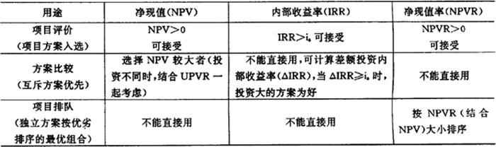 式中:(CI-CO)t——第t年的净现金流量; n——项目寿命周期; EIRR——经济内部收益率。 一般地说,当项目经济内部收益率大于或等于社会折现率,表明该项目对国民经济的净贡献能力达到了要求水平,反之,则达不到要求水平。 上述三个动态评价指标均是在折现计算的基础上进行的。但在国民经济评价中,这三个指标应用范围各有侧重。对此,国家计委公布的评价方法中曾作了一个归纳,如表6.4.3-1所示。 表6.4.3-1 净现值、内部收益率和净现值率的应用范围