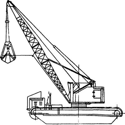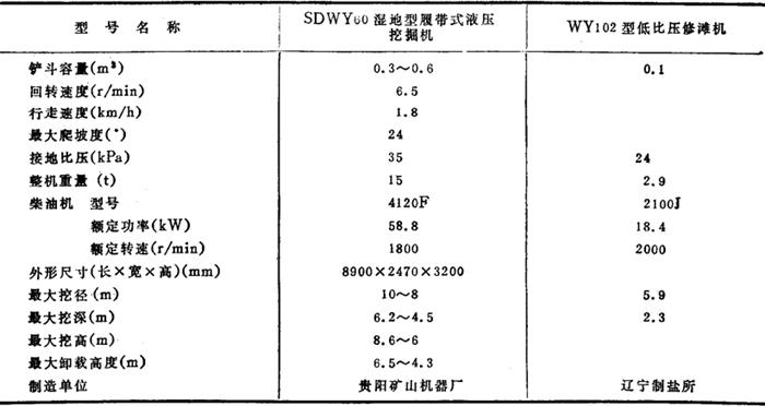 | 释义 | 挖掘机和平地机 盐田土质渲软,承压能力低,有时还需要在浅水中进行修埝、筑提作业,因此常使用沼泽地挖掘机(水陆两用挖掘机)和湿地挖掘机。为了实现机械化修埝,近年来还试制了盐田专用小型修滩机和平池机。 (一)沼泽挖掘机(水陆两用挖掘机) 行走机构采用双体船式浮动箱结构履带架,对地比压很低,可浮游于水面,可在浅滩、沼泽、软土上作业。除有反铲外,也能改装为拉铲挖掘机和起重机等(图2-8-55)。部分沼泽挖掘机性能见表2-8-56。