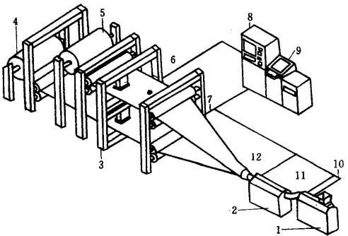 图19-19 挤出发泡生产线微机控制示意图 1-塑化挤出机 2-冷却挤出机 3-包括传感器的高速扫描器 4-下卷辊 5-上卷辊 6-高速多点测量器 7-线速度控制 8-操作控制站 9-指令数据终端 10-塑化挤出螺杆速度控制 11-发泡剂流量控制 12-冷却挤出螺杆速度控制 微机控制系统的基本组成单元是:测量装置、操作控制站(简称PCS)和指令数据终端。 1.测量装置 微机控制系统关键的工作之一是数据采集工作,这通常要由测量装置来完成。图19-19所示系统具有高速扫描装置和传感元件。用这种先进的测量单元可以迅速而准确地测出厚度和质量(或密度)。 每台PCS具有两个高速扫描器,每个扫描器又具有两个传感器。这些传感器以0.3m/s的可变速度在发泡制品表面往返移动。目前,用于发泡制品的传感器有两种。 (1)机电传感器 这种机电传感器用来直接测量发泡制品的厚度,所以,又称测量传感器。测量厚度范围为0.25~25.4mm,以及8.9~101.0mm。 (2)核子传感器 核子传感器用来测量发泡制品的密度,它可以自动补偿制品温度变化的影响。 所有传感器信号都转换成数字信号由微机进行处理。微机对挤出发泡全过程的控制是通过两个环节来实现的。一是一系列的直接数字控制环节(简称DDC),另一种是一系列监控环节。具体的控制关系列于表19-2和表19-3。 表19-2 直接数字控制