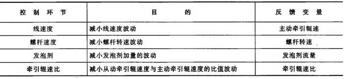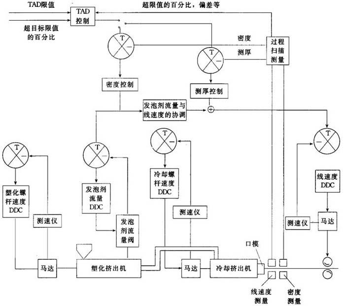 | 释义 | 挤出发泡微机控制系统 目前,微机控制技术的应用已给现代挤出发泡生产线带来新的活力。一些已经商品化的挤出发泡生产线微机控制系统可使发泡制品的厚度、密度波动大为减小,并且减少了废料和试车时间,提高了产量。图19-19是一条带有微机控制系统的挤出发泡生产线示意图。
