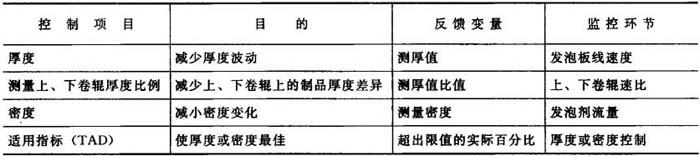 由表19-3可知,控制厚度波动的监控环节是发泡板的线速度,它是通过调节牵引辊的线速度与挤出速度相匹配来控制的。每次传感扫描到末端时,就将当时测出的平均发泡制品厚度值与目标值进行比较。计算机根据测量值与目标值的偏差量来精确调节牵引辊线速度。 控制制品发泡密度波动的监控环节则是发泡剂的加入量。计算机经过对传感器送来的信号进行处理,得出了发泡板当时的平均发泡密度,将平均发泡密度与目标密度相比较,就可以得出当时发泡密度的平均值与目标值差异的大小,计算机根据这一差值进行发泡剂添加量的调节,以减少平均密度与目标值的差别。图19-20给出了简化了的控制流程图,结合表19-2和表19-3以及图19-19,就可基本了解挤出发泡生产线的微机控制概貌。