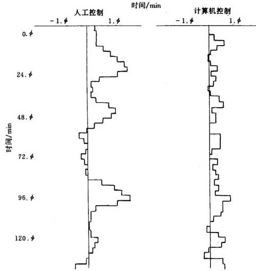 图19-20 挤出发泡生产线微机控制流程图 2.操作控制站 操作控制站可提供控制、传感器数据处理、显示、数据收集、发出警告并记录传输等功能。PCS包括一台16位的微处理机,它可完成传感器控制,显示出挤出发泡生产线的运行状态。显示内容有:制品横截面的轮廓线、生产中有关参数分布曲线图等,所有显示都可用七种颜色来表达。 3.指令数据终端 指令数据终端(简称IDT)通常可支持8个操作控制站。IDT包括一台微处理机和打印设备等。它的主要作用是打印运行记录、拷贝屏幕显示的内容、存入操作数据等。 用微机控制的发泡板材厚度变化比用人工控制的板材厚度变化减少了45%;同样,在减少发泡密度变化方面,微机控制也发挥了很大的作用。图19-21即为用两种控制方法所得到的发泡板密度变化曲线。