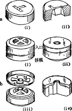 图4-8 挤出模的种类 a.实心型材模 (i)钢坯侧 (ii)断面 b.螺孔模 (i)前面(钢坯侧) (ii)后面(挤出侧) (iii)分解图 (iv)断面图 |