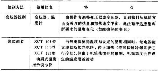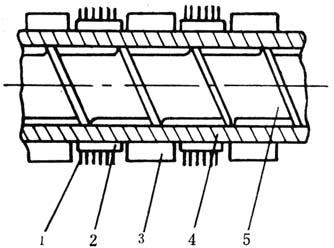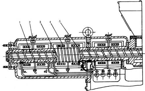 图4-1-17 机筒加热,冷却和调节的系统 1-热电偶 2-温度计插座 3-冷却水管 4-应加热器 5-水冷控制阀 (一)加热系统 1.加热方法的种类和特点 挤出成型机中对塑料的外加热方法有三种:电阻加热、电感应加热和载体加热。载体加热时使用的介质有蒸汽、矿物油或其它有机液体。因载体加热存在许多问题,故极少采用。一般用的都是电阻加热或电感应加热,其特点见表4-1-16。铸铝加热器和工频感应加热器见图4-1-18;电感应加热器的使用寿命参见表4-1-19。