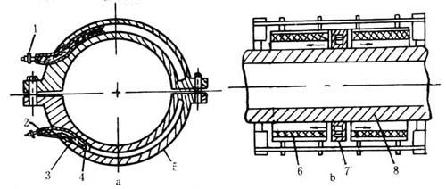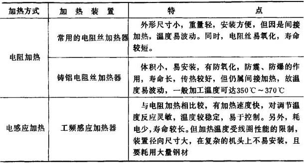 图4-1-18 铸铝加热器和工频感应加热器 a铸铝加热器 b感应加热器 1-接线柱 2-钢管 3-电热杯 4-电热丝 5-金属铝 6-线圈 7-风环 8-机筒 表4-1-18 电阻加热和电感应加热的特点