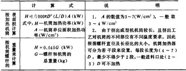 2.挤出成型机机筒加热功率的确定机筒的加热功率计算式见表4-1-20。 表4-1-20 机筒的加热功率计算式