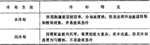 (二)冷却系统 挤出成型机需要冷却的部位有机筒、螺杆和料斗座。冷却的方法有水冷和风冷两种。两种冷却方法的比较见表4-1-21所示。 表4-1-21 水冷和风冷的比较