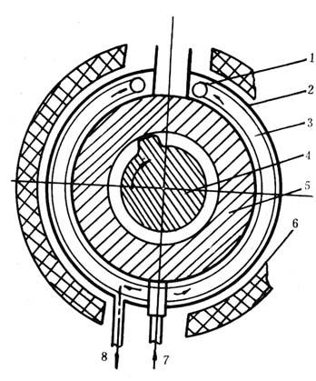 图4-1-19 SJ65的冷却系统 1-喷水管 2-水套 3-上水管 4-螺杆 5-机筒 6-加热线圈 7-进水管 8-出水管 风冷系统可用于所有的挤出成型机中,在设计风冷系统时,机筒外表面应设有风罩,以保证合理的空气流道。为了加速散热效果,设有铸铝加热器的往往还在它的上面铸出散热片或特制的称为“刺猬”状的冷却装置,以扩大散热面积,见图4-1-20和4-1-21所示。