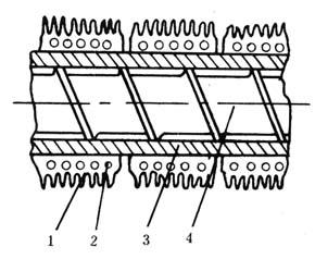 图4-1-20 带散热片的铸铝加热器 1-散热片 2-加热棒 3-机筒 4-螺杆