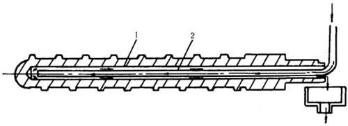 图4-1-21 “刺猬”状冷却装置 1-铜棍 2-铜环 3-加热器 4-机筒 5-螺杆 2.螺杆的冷却 如上所述,螺杆的冷却主要是防止塑料的过热,以免发生分解。螺杆的冷却是通过向其中空部分压进冷却介质而得到实现。通入螺杆的冷却介质可以是水,也可是空气。为适应加工过程的工艺需要,螺杆的冷却长度可以通过进入管来调整。螺杆冷却装置见图4-1--22。