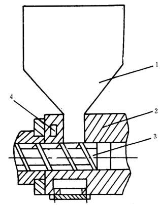 图4-1-23 料斗座冷却装置 1-加料斗 2-料斗座 3-螺杆 4-料斗座冷却孔道 (三)挤出成型机的温度控制 1.温度控制原理 温度控制原理如图4-1-24所示。