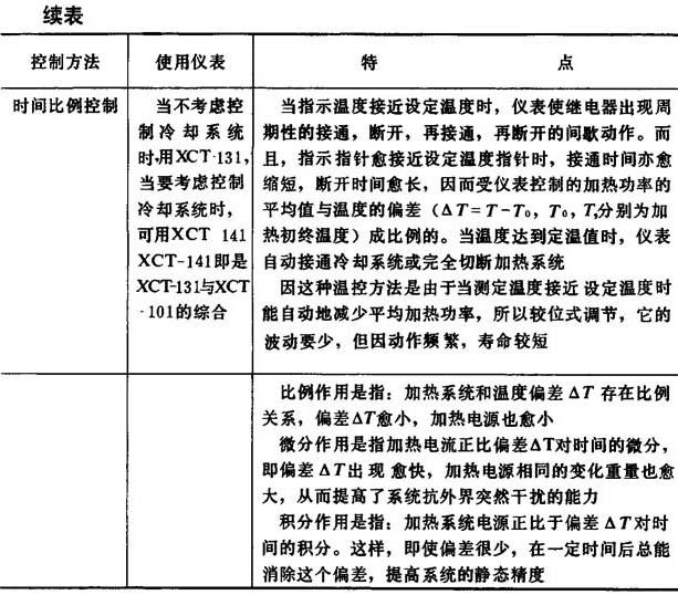 图4-1-24 温度控制原理图 2.温度控制的方法 温度控制的方法以及所用仪表的特点见表4-1-22所示。 表4-1-22 温度控制方法及所用仪表的特点