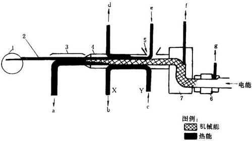 | 释义 | 挤出过程中的能量流 图5-1是挤出成型的能量流示意图。在成型加工中,所有机械能由摩擦转变为热能或其它形式的能量。而机械能则是由电机将电能转变为机械能,以驱动螺杆。减速箱在内的驱动装置将部分机械能在轴承系统转变为热能,在减速箱内的润滑剂由于粘性效应也产生了热能。在电机中由于涡流或其它原因也有电能的损失。