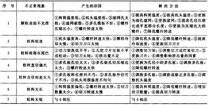 *从加料斗处开始。 制造PE绝缘粒料或护套粒料时,用同向旋转排气式双螺杆挤出机组,螺杆结构为组合式,螺杆直径为Φ60mm,挤出温度如下: 料筒温度1(从加料口开始)为200~220℃;料筒温度2为230~240℃;料筒温度3为240~250℃;机头温度为250~260℃。此法为向下拉条,水箱冷却。 (六)挤出造粒中不正常现象、产生原因及解决方法 现将干热切粒法挤出造粒时不正常现象、产生原因及解决方法列于表17-4。 表17-4 干热切粒法挤出造粒时不正常现象、产生原因及解决方法