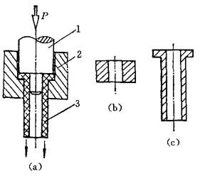 图8-3 复合挤压 (a)复合挤压示意图;(b)毛坯;(c)挤压件 1—凸模;2—挤压件;3—凹模
