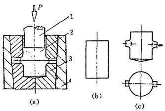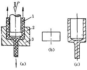 图8-1 正挤压 (a)正挤压示意图;(b)毛坯;(c)挤压件 1—凸模;2—凹模;3—挤压件