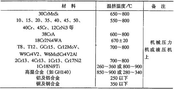 2.温挤压时变形温度的选择 在温挤压时,选择的温度应在金属开始出现强烈氧化之前,并且应避开兰脆区.一些材料的温挤压温度见表8-5. 表8-5 一些材料的温挤压温度