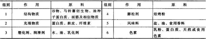 这里必须注意到所有的外加物质都会改变物料在加工中的变化情况,并且影响挤压食品的质量,这可能是外加物质冲淡了配料,影响了相互作用或改变了混合物的黏度。其中许多物质同时有多种功能,如糖可以稀释混合物,在溶解物料中作为柔软剂,并影响味道和色泽的变化。 表2-7-1中列出了三种挤压产品配方的应用实例,根据配料可分为六组:第一组为面粉、淀粉、蛋白质等,这一部分比例最大,是产品物质结构中最主要、最基本的聚合物。第二组为蛋白质和纤维成分,这两种成分在主要结构中是松散体,如把聚合体与松散体比较,那么松散体在整个配料中起填充剂的作用。第三组为水和油物质,它们是作为塑化剂和润滑剂使用的。第四组为糖、盐、味精等,作为调味剂使用。第五组为焙烤粉和麸皮,它们可提高气泡数量,产生好的膨化组织结构。第六组是乳粉和食用色素,它们可产生较好的风味和色泽。 根据挤压过程中各种配料的功能进行分类,也有一定的合理性,可参见表2-7-3所示。 表2-7-3 用于挤压加工原料的分类