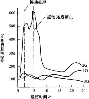 (三)振动与生理反应 1.由外伤引起的呼吸上升 通常果蔬组织在切伤或受到部分破坏性的伤害刺激之后,呼吸明显上升。实验证明,夏橙及橙往桌上跌落、摔伤,使其产生外伤,呼吸就明显上升。温州蜜柑也看到了同样的现象,且跌落距离越高、跌落越重,呼吸上升越快。模拟滚动选果、滚动装箱、加压以及受小伤等,都会立即引起呼吸的上升。温州蜜柑由于跌伤造成呼吸上升的同时,伴随有化学成分的变化。装箱的梨,由于振动受伤呼吸也增加了1.5倍。纸箱包装莴苣在振动中,也观察到了呼吸急剧地上升。 根据这些室内模拟选果和运输试验的结果推测,在实际运输中也会因受伤害而发生呼吸上升。其结果不仅造成受伤果蔬外观品质降低,而且也因呼吸加剧造成内含物消耗增加和风味下降,这必须引起注意和认真对待,防止运输中的机械伤害。 2.非外伤的振动与呼吸强度 果蔬组织被切断或部分受伤时,在代谢上最明显的反应就是呼吸上升,上面已有论述。但振动而没有引起外伤时,果蔬在生理上是否有反应,这对于了解运输振动的影响很有意义。对番茄进行的各种试验证实,在不引起外伤的振动后,能引起呼吸强度明显上升。 实验证明,振动开始后呼吸强度立即上升,继续振动时呼吸继续上升,振动3h后终止,呼吸虽然有一个短暂的下降,但随即继续上升。其中振强为2g的可使呼吸明显上升;而振强为1g或3g的对呼吸上升的影响并不显着(见图4-2)。可见,番茄对振动刺激是有一定范围的,超过这个范围或不及这个范围的振动都不致引起生理异常。但果蔬种类不同其允许的范围也不同,茄子、苹果的允许范围较窄,对振动的敏感性较高。