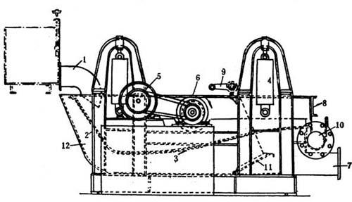 图6-5-1 振框式平筛 1-浆料进口 2-筛板支架 3-筛板 4-弹簧装置 5-振动偏心轮 6-电动机 7-细浆出口 8-筛渣槽 9-控制连杆装置 10-筛渣出口 11-泵料水位控制板 12-浆槽