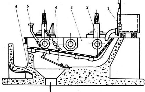 图6-5-2 高频振框式平筛 1-进浆箱 2-减振器 3-筛框 4-浆位调节板 5-喷水管 6-粗渣沟 表6-5-6 高频振框筛的主要技术特征