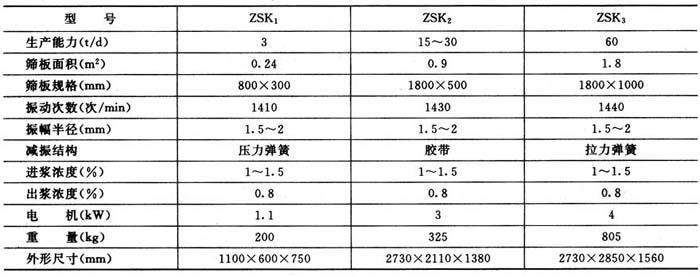 图6-5-8 高频振动圆筛 1-浆槽 2-筛框 3-框架 4-锥形管 5-转轴 6-偏重轮 7-减振弹簧 8一软管接头 高频振动圆筛有多种型式,除了结构略有差别外,其工作原理和性能相似。 由于筛鼓作高频振动并转动,提高了筛分能力,浆料通过筛缝的阻力小,因此这种圆筛具有生产能力高,占地面积小,筛选质量好,能在较大的浆料浓度(1.2~1.5%)下进行筛选等优点。 高频振动圆筛的筛缝多为长缝,故除用作一般浆料的筛选外,也适合于长纤维浆料的筛选。它操作简单,缺点是结构复杂,拆装较麻烦。 (2)高频振鼓圆筛的技术特征 表6-5-17 高频振鼓圆筛的技术特征