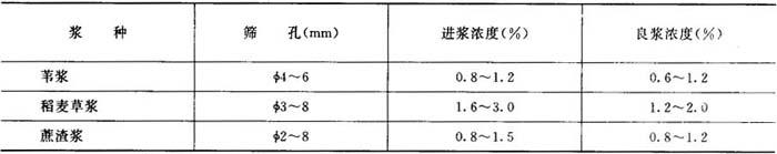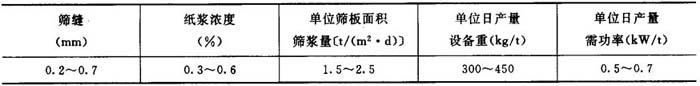 ②喷射冲洗液——喷液量越大,压力越高,除节效果越好。 一般喷液量15(m3/t)左右,压力在196~245kPa。 较小筛孔,喷射冲洗压力要加大到450kPa。 ③碱法草浆的振框筛工艺条件见表6-5-11。 表6-5-11 碱法草浆的振框筛工艺条件