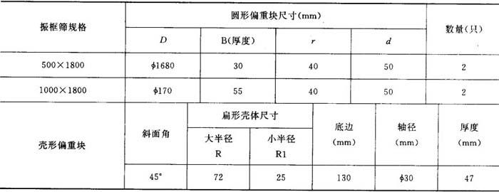 (6)安装使用要求 ①振框筛良浆位置一般应高出离心筛或洗浆机的浆位1.5~2m。 ②各偏重块的偏重力矩和方向必须相同。开车时各偏重块的偏心方向都应在回转轴的正下方。对于壳形偏重块应使两边45°斜边角度相等。对可调节偏重的偏重块,应使每块的偏重量和偏重距相等。 ③同级减振器的刚度和安装后的原始变形量应相等,以免因受力不均匀而变形。 ④开机前振框筛按正常生产浆位充满水,提高介质阻力,以免使振幅过大越过共振区,撞击或损坏轴头、机件等。 ⑤进浆一致,防止偏重损坏设备。 表6-5-13 振框筛偏重块的技术特征