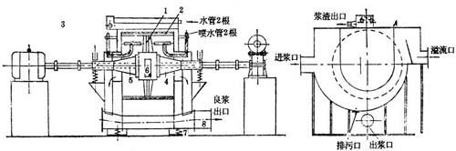 ①振幅加大,产生能力加大。 ②振动频率--凸轮转数×凸轮边数,加大频率可提高筛板的净化效能。 (5)检修安装注意事项 ①装配主轴轴承及其密封装置,要求以不掺入浆水为准,保护润滑良好。 ②筛框通过四根弹簧稳固地悬挂在支架上,当筛框静止时,框面应位于水平面上,因此在安装时要选用同一规格与劲度的弹簧。用水平尺在露空的主轴上测量水平度,其允许误差为0.2mm/m。 ③偏重块与主轴要求紧密配合,并用钩头键强行打入,预防在振动时松脱,国内常用的偏重块有壳形和圆形两种,安装时要注意:对于壳形偏重块即要求在停机时,其两端偏重块的偏重方向,均在主轴正下方。同时必须注意偏重块的旋转方向要适当,即面对筛框。若粗浆出口在左边,偏重块应按反时针方向旋转,才能使粗浆向排渣口移动。 (6)操作注意事项 ①开机前必须检查平筛各部是否正常完好。检查完毕后,按生产时正常浆位先充满水,以防启动电机后由于筛框无介质阻力,而使振幅过大,以致发生机件碰击和损坏轴头密封装置。 ②正常运转中要经常注意通过平筛的浆料内有否大的节子等杂质。如有,应及时停机检查筛孔是否损坏。如发现粗节中含有大量好浆时,应加大喷水,调节水位和调整进筛浓度。 ③不得一侧进浆,以免偏重,损坏设备。 ④停机前,先停浆,关闭挡浆板,然后再停机,最后关闭喷水管,并冲洗设备。 3.高频振动圆筛 (1)概述 如图6-5-8所示,它包括一个在浆槽中转动的圆形筛鼓,和支持筛鼓并联结偏重结构的框架。浆料进入筛板外部的浆槽中,良浆穿过筛板进入筛框内由两端排出,筛板上形成的纤维层由振动破坏。筛板上附着的浆渣及杂质随转子转到上方时,由筛框内的固定喷水管喷洗下掉入粗渣排出槽排出,筛鼓的转动和振动分别是由二台电机通过联轴器和减速箱而产生的。因此筛鼓既高频振动又慢速转动。