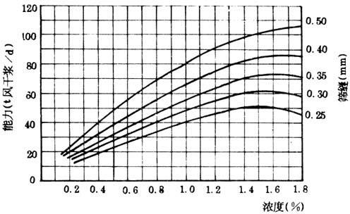 (5)影响生产能力及筛选效率的因素 ①纸浆种类、浆料浓度和筛缝宽度的影响,见图6-5-9。