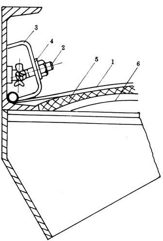 图6-5-11 筛网卷边 1-黄铜棒 2-30目铜网 3-双目镀锌铁丝网 4-0.5mm厚紫铜片 5-锡焊缝 6-锡点焊 ③将卷边筛网平整地铺放在嵌着橡胶条的小号槽钢框架上,然后按图6-5-12所示,利用钢板弯成的张网槽网,其下边压着筛网的卷边处,上边顶着筛框槽网,只要旋紧筛框内壁上的一排收紧螺丝,即可均衡地张紧铜网,此时应注意加上弹簧垫圈,防止螺母受振脱。