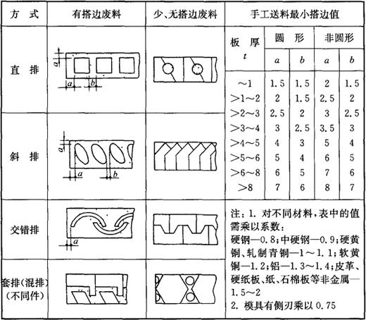 式中 F0——裁件面积; B——条料宽度; L——裁料时的冲裁步距。 常用排料方式及搭边见表4-21。 表4-21 排料示例及金属材料手工送料最小搭边值