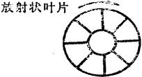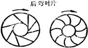 图3-63 叶片形状 ②片型(径向式)排风机——叶片数6~12个,效率为50%~60%,合适的静压为0.5~3千帕斯卡。其特点是阻力变化时风量的变化大。叶片结构简单、结实,适于处理含尘气体,其示意图见3-64。