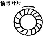 图3-64 叶片形状 ③限制杆排风机——叶片数12~24个,效率为50%~60%,合适的静压为2千帕斯卡以下。其特点是在套管式吸入部分安装有放射状固定导向叶片,运转时可减小阻力。旋转气流能够限制风量的增加,所需动力因此不会超过某一限度(其示意图见3-65)。