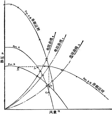 3.6.5 送风机联合运转 (1)并联运转 两台送风机并联运转时,则成为压力相等点空气量之和。因此,根据FanA、FanB各自的特性曲线作图,可以得到并联运转的特性曲线。 因为送风机的运转点是阻力曲线与特性曲线的交点,阻力曲线不动则风量大,阻力曲线变化时,风量基本不增加。但是,无论怎样,两台送风机并联运转都达不到它们的能力之和。因此,如果真需要两机并联运转,则需重新设计较粗的管道,必须做到阻力曲线达到其风量之和。 (2)串联运转 两台送风机串联运转时,则变成风量相同点的压力之和。与并联运转一样,作图可得出联合压力曲线。这时,阻力曲线越大,风量增加越少。如果希望增加风量,则必须选择并联或串联运转之一。 阻力曲线c:阻力曲线为c时,无论哪种运转方式,气体进量的增加是相同的。但是,从轴动力来看,并联运转时,动力相当于JA、JB;而串联运转时,动力相当于GA、GB。因此,并联运转所用动力较少。 阻力曲线b:阻力曲线为b时,并联运转较好。 阻力曲线a:阻力曲线为a时,串联运转的风量变大。在联合运转时,要研究联合压力曲线和阻力曲线,以决定用并联或串联方式,同时还要考虑动力问题。 使用两台同样性能的送风机时,问题较少。使用两台性能有很大差别的送风机联合运转时,事前要进行充分的调查研究。 三台以上的机器联合运转时,与上述道理一样,可以求出特性曲线。 送风机联合运转曲线示于图3-69。(图中电阻曲线应更正为阻力曲线)