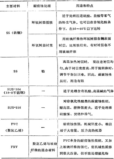 图3-72 高温运转排风机运转时的压力 温度上升时,气体体积膨胀,质量不变,密度下降。排风机的处理体积是不变的,所以,即使温度发生变化,风量基本不变。但是,压力变动与密度变化成比例,所以,温度上升,压力会下降。 看图3-72可知,取横轴的常温压力,可在纵轴上得到高温时的换算压力。另外,排风机的轴动力与(风量×压力)的结果成比例,所以,如果温度上升,则轴动力下降。 在高温下运转的排风机与风量、压力和轴动力有关,不仅如此,还应注意它的结构。如果气体中不含腐蚀性物质,其结构要求如下: 材料:温度在250℃以下时,可用普通钢;如果高于此温度,应使用不锈钢系列的材料。 轴承:温度在100℃左右,可用空气冷却轴承;超过150℃时,采用水冷轴承。另外,还应使用耐热的润滑剂。大型排风机要使用带有油冷却器的油浴器式或强制润滑式的。 3.6.9 经过耐腐蚀处理的排风机 经过耐腐蚀处理的排风机见表3-20。 表3-20 经过耐腐蚀处理的排风机