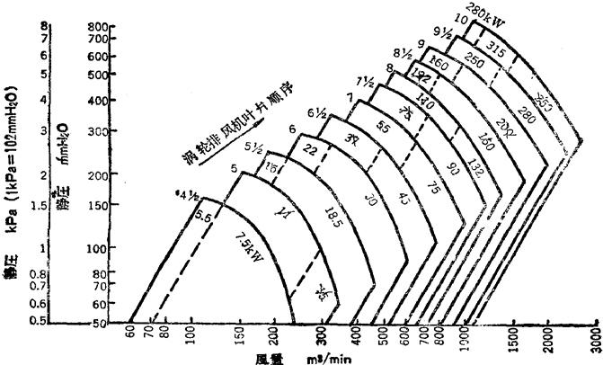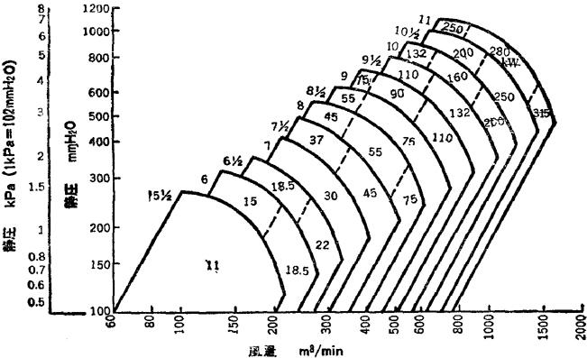 图3-70 空气1m3/min时的动力(η:送风机效率) 3.6。7 风量、静压、排风机轴动力、电动机关系 风量、静压、排风机轴动力、电动机关系见图3-71。